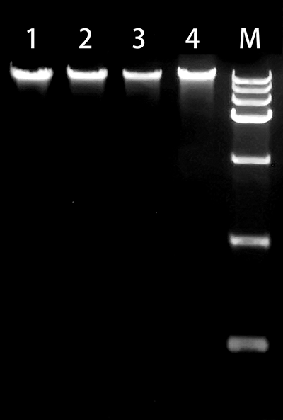 下图:用Simgen DNAzol试剂从革兰氏阴性菌(1、2、3、4为同一菌种)中提取纯化DNA的效果。