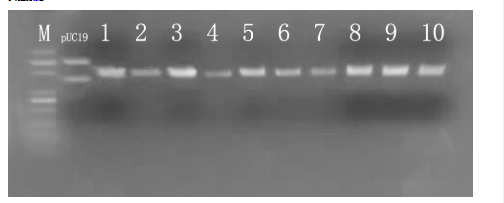 由上图可以看出,提取的重组质粒的长度均长于pUC19超螺旋质粒,证明挑取的10个单菌落均为阳性菌落。